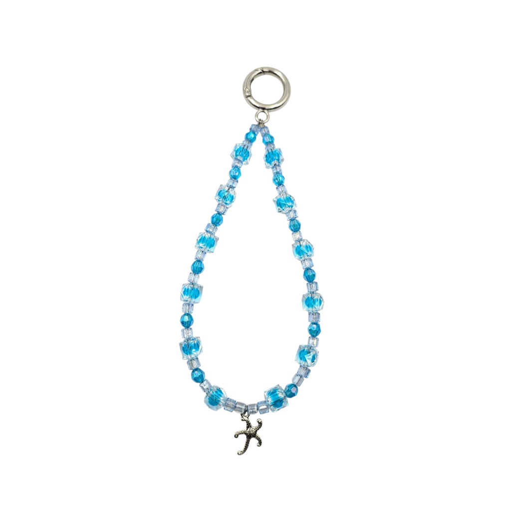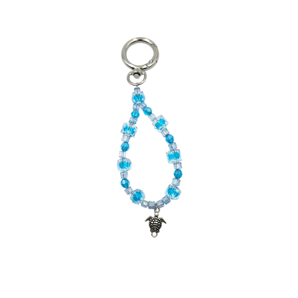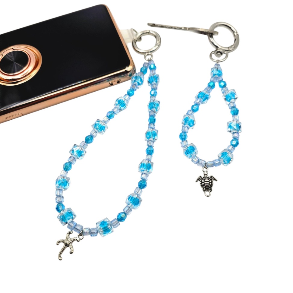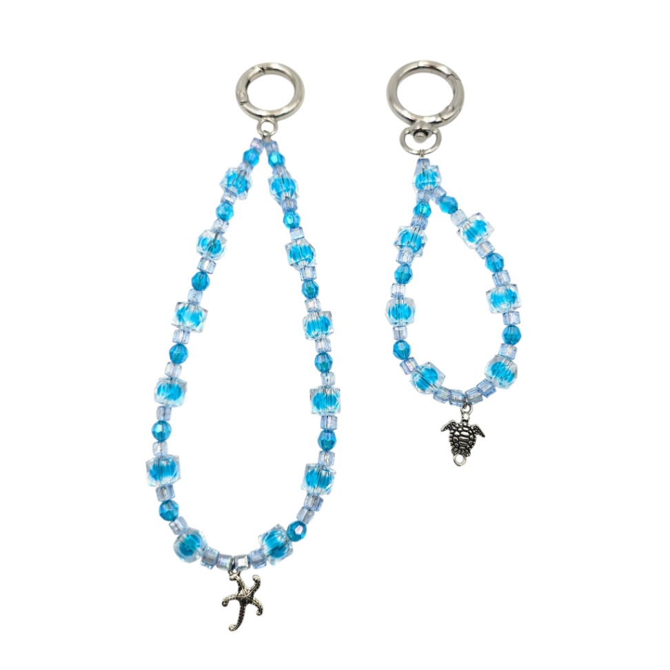 Meticulously crafted with a variety of blue faceted beads, the design is elevated by transparent blue cubic crystals that catch and reflect light beautifully. The silver-tone charms—a delicate starfish on the phone strap and a detailed sea turtle on the keychain—add a sophisticated marine touch to the overall aesthetic.