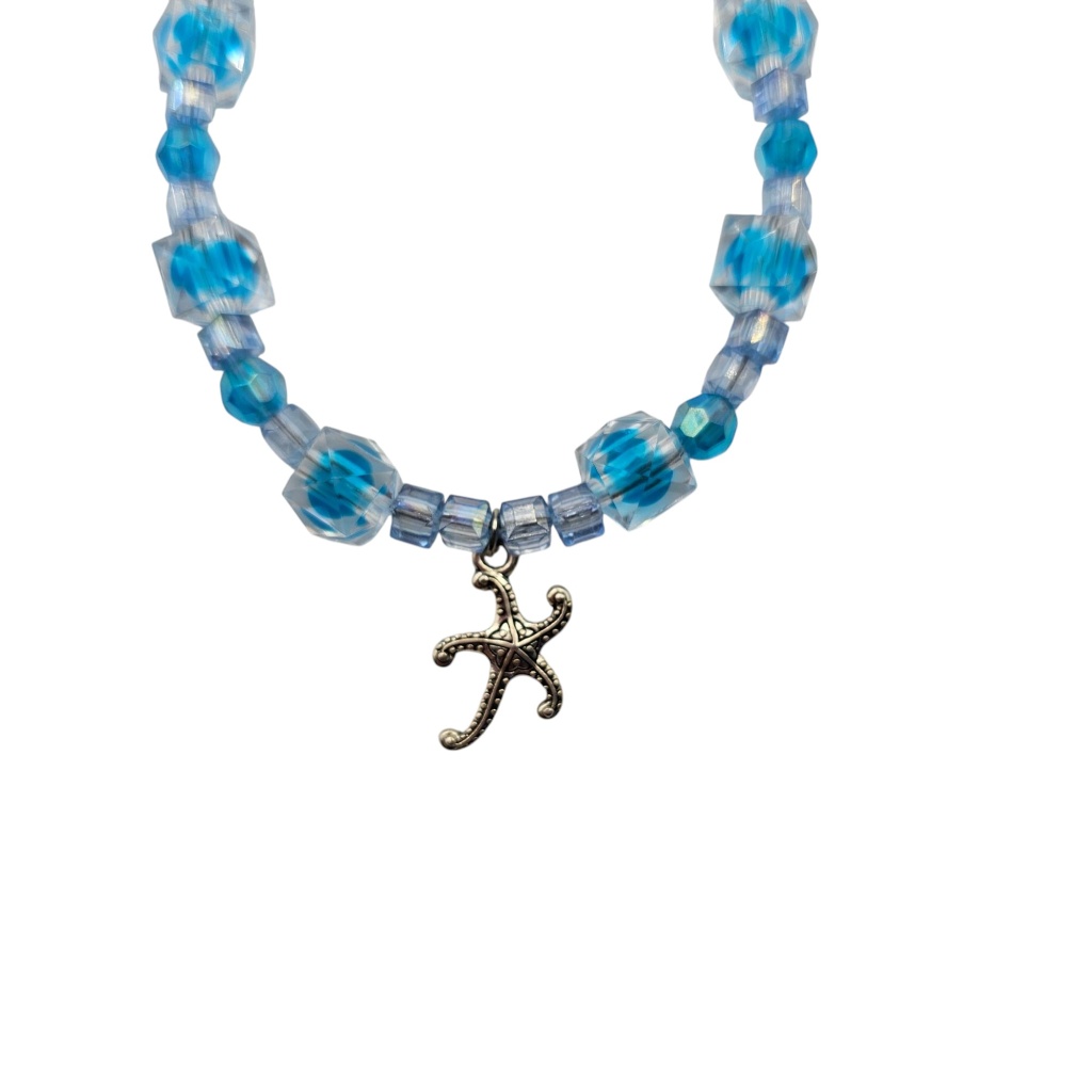 A refreshing, handcrafted accessory duo featuring vibrant sky-blue crystals, geometric cubic beads, and intricate silver-tone sea life charms. A serene statement piece designed to bring a touch of coastal charm to your special event attire.