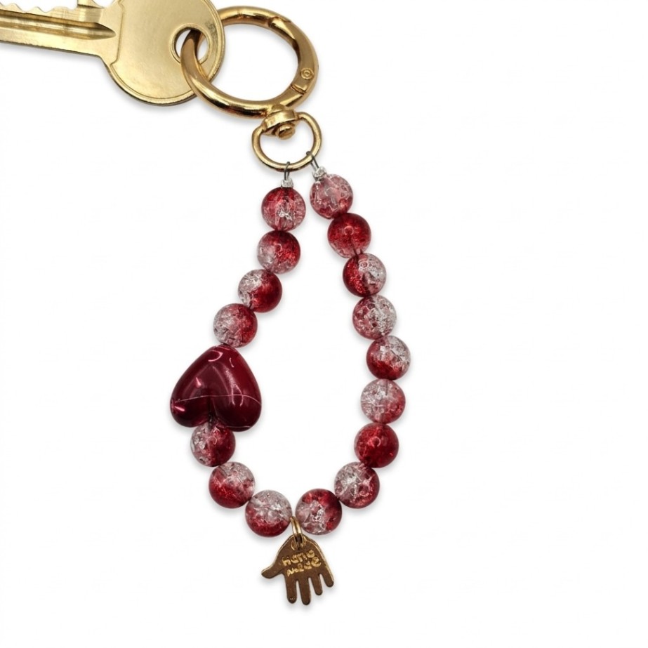 A bold and passionate keychain featuring a large ruby-red heart and a unique gold-tone hand charm. A stylish way to show your love for artisan-style accessories while keeping your keys secure