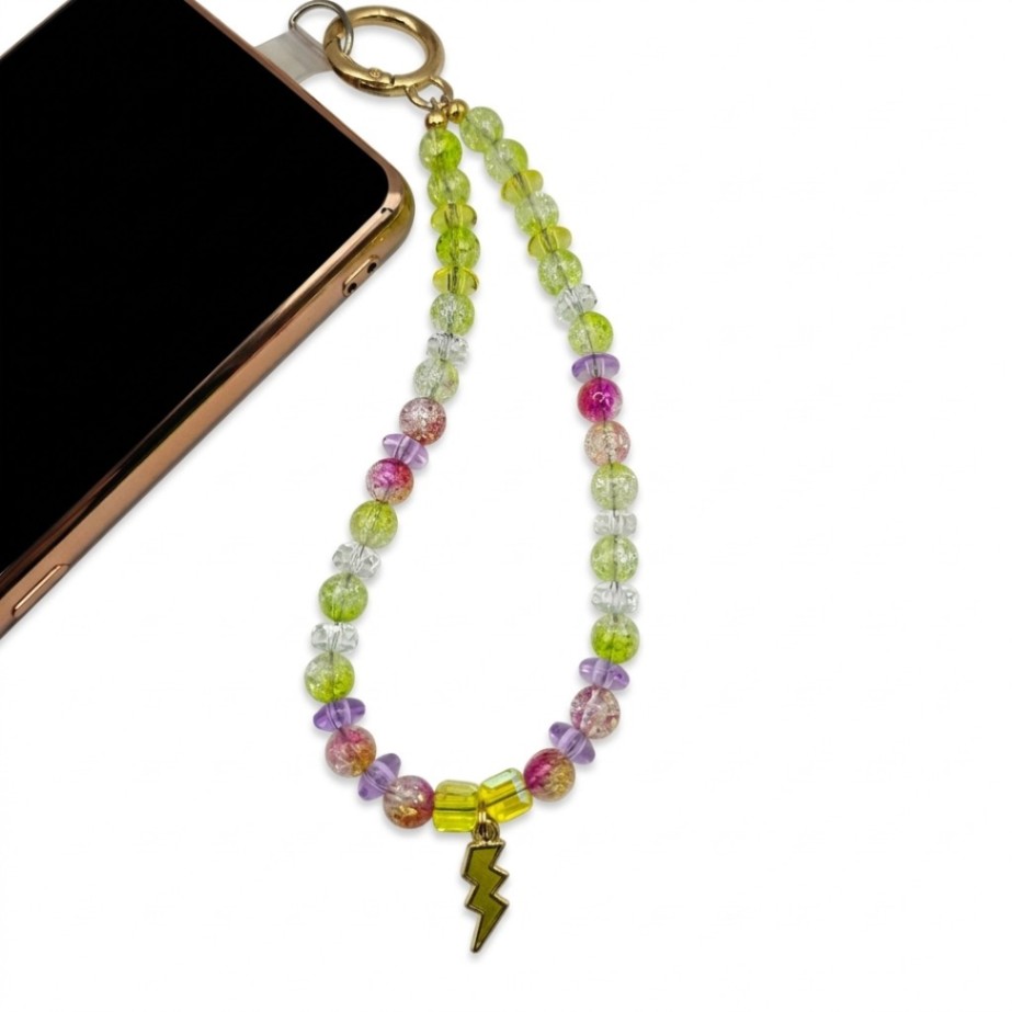 A high-energy phone accessory featuring a bright yellow lightning bolt charm and a vibrant mix of neon lime, purple, and crackle pink beads. The ultimate statement piece to bring an “electric” vibe to your phone.