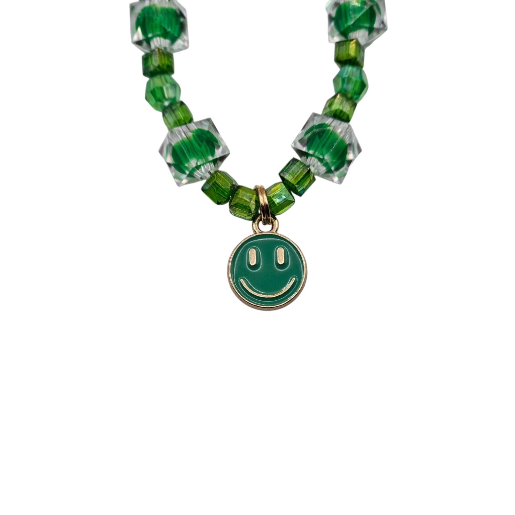 Meticulously crafted with green faceted beads and transparent cubic spacers, the design creates a brilliant, multi-dimensional sparkle. The gold-tone hardware and the charming green-enamelled smiley faces add a whimsical yet polished touch to the overall aesthetic.