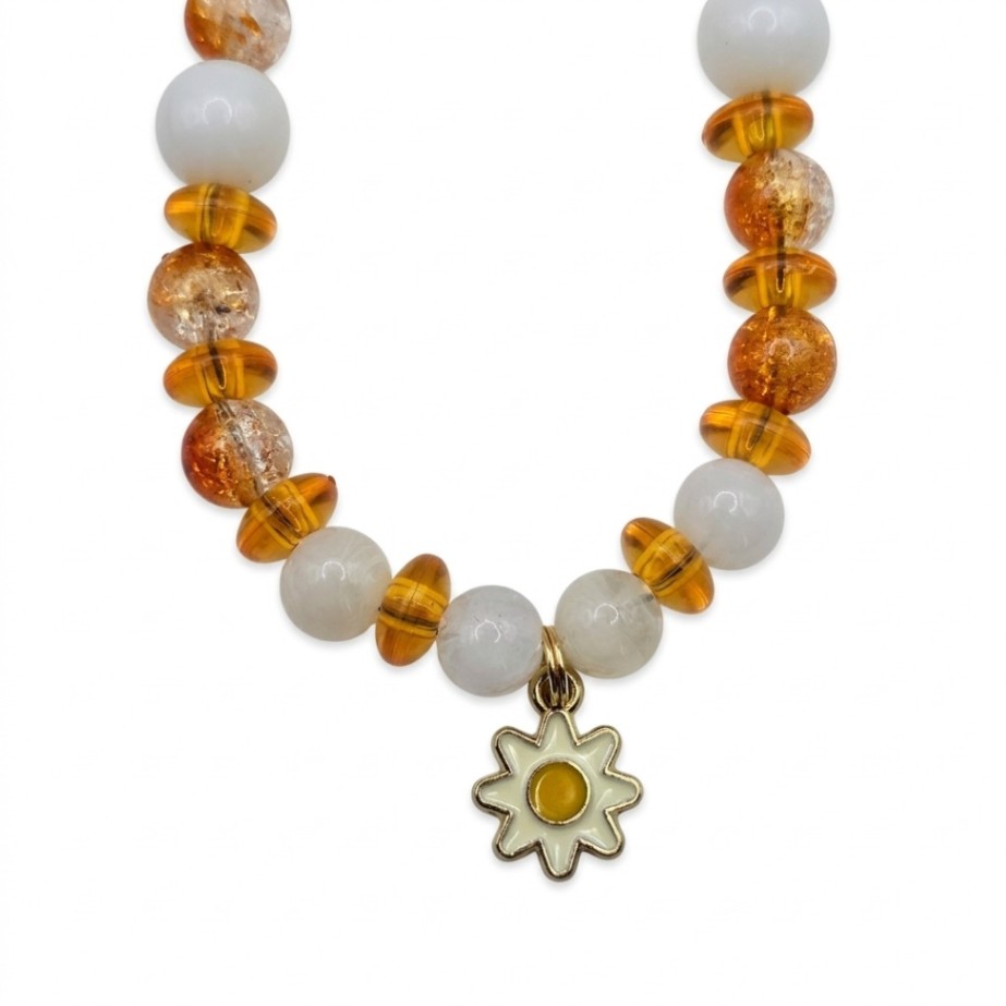 Beads: Amber crackle beads, opaque white beads, and transparent orange spacers.