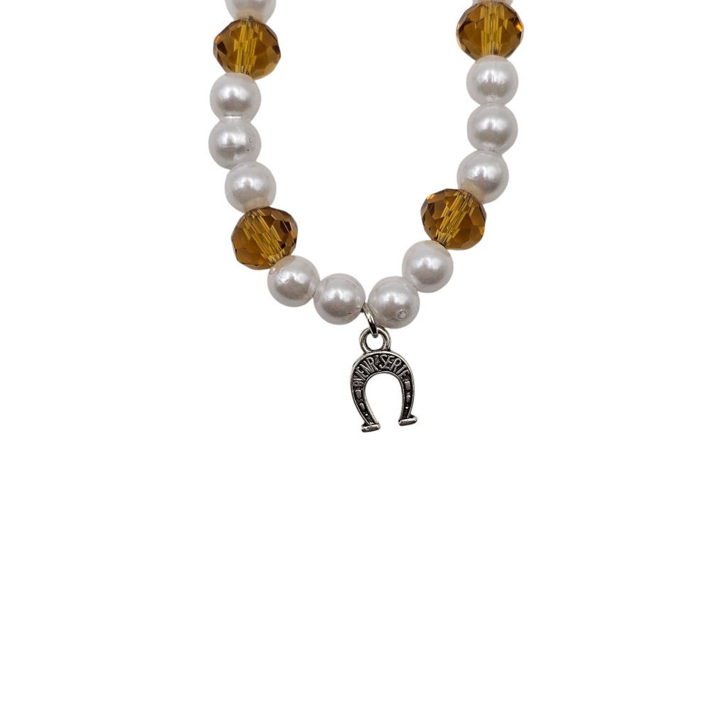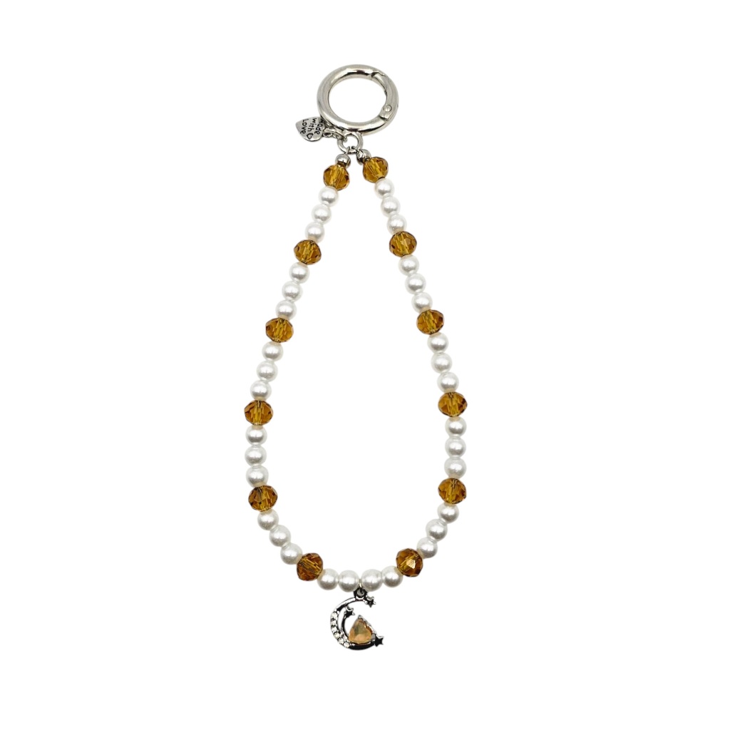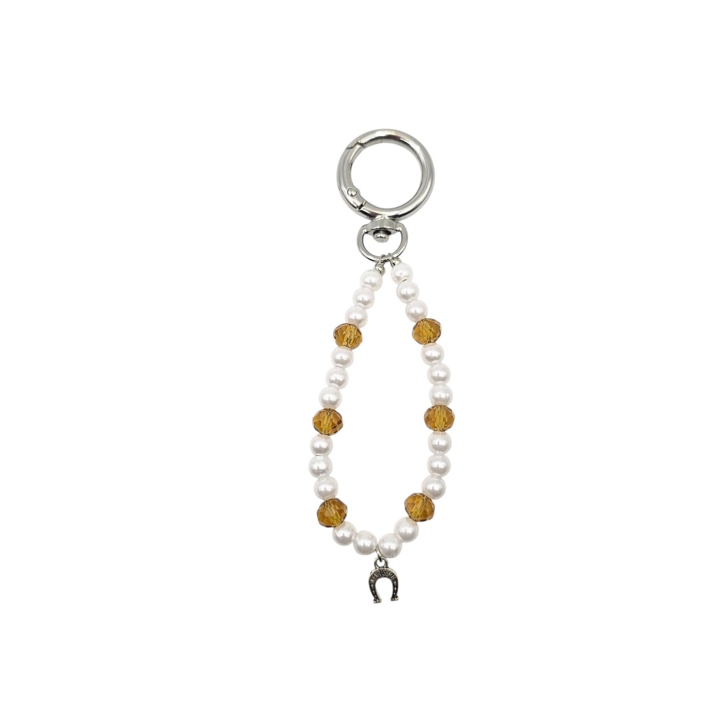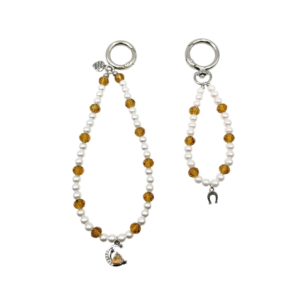 Crafted with high-quality white pearls interspersed with warm, honey-toned faceted crystals, the design offers a beautiful contrast between creamy textures and sparkling clarity. The silver-tone crescent moon charm (on the strap) and the horseshoe charm (on the keychain) add a layer of meaning and charm, making this set both a stylish and lucky companion.