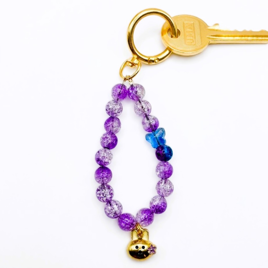 Brighten up your accessories with this delightful beaded keychain. It features a shiny gold-tone animal charm with a tiny purple flower detail, paired with high-quality purple crackle beads that sparkle with every movement.