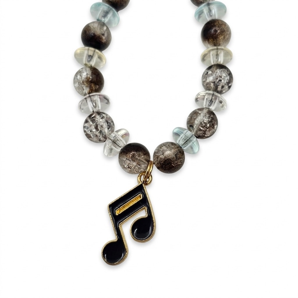 This keychain is designed for those who love music. It features a striking black and gold-tone musical note charm, paired with textured beads in smoke and clear tones.