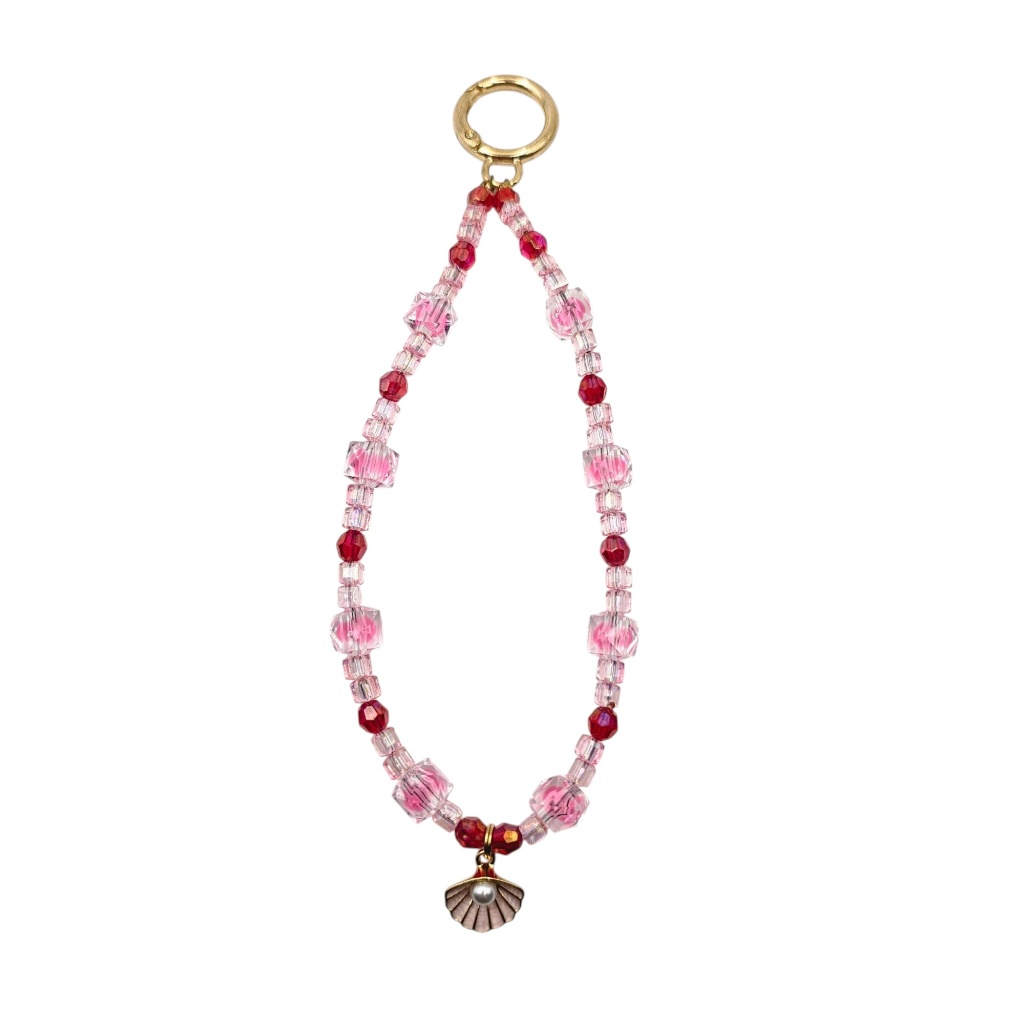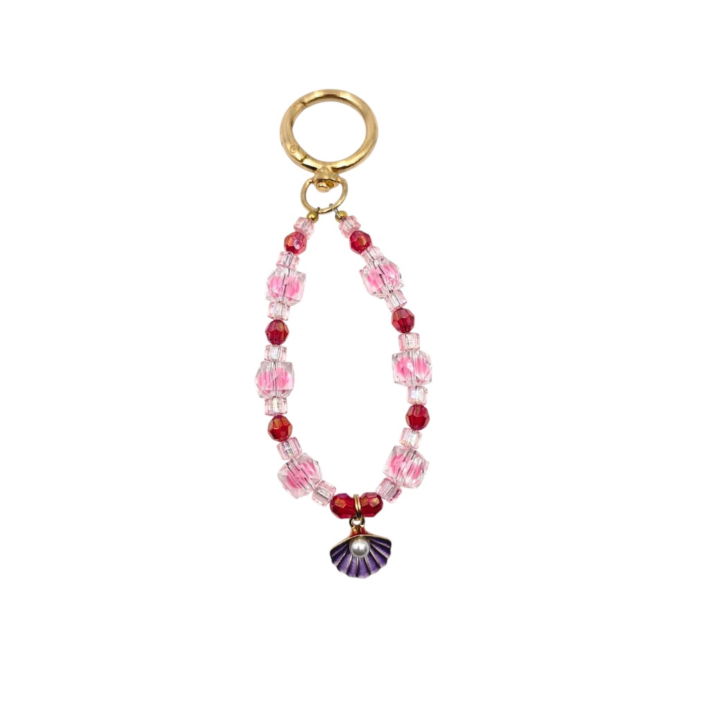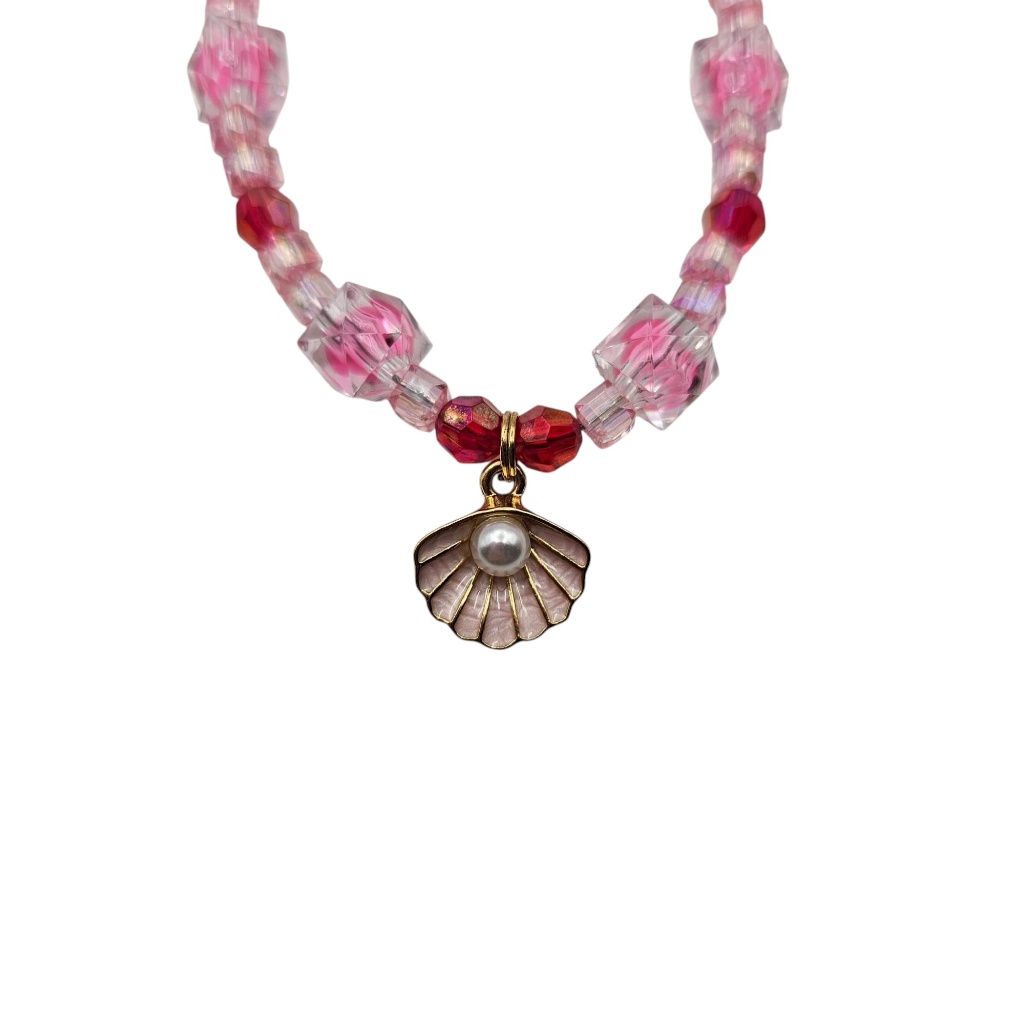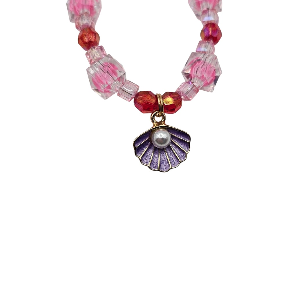 Meticulously crafted with a mix of soft pink faceted beads and deep red accents, the design is elevated by transparent cubic crystals that catch the light beautifully. The gold-tone seashell charms, finished with a lovely purple enamel and a central imitation pearl, add a sophisticated marine touch.