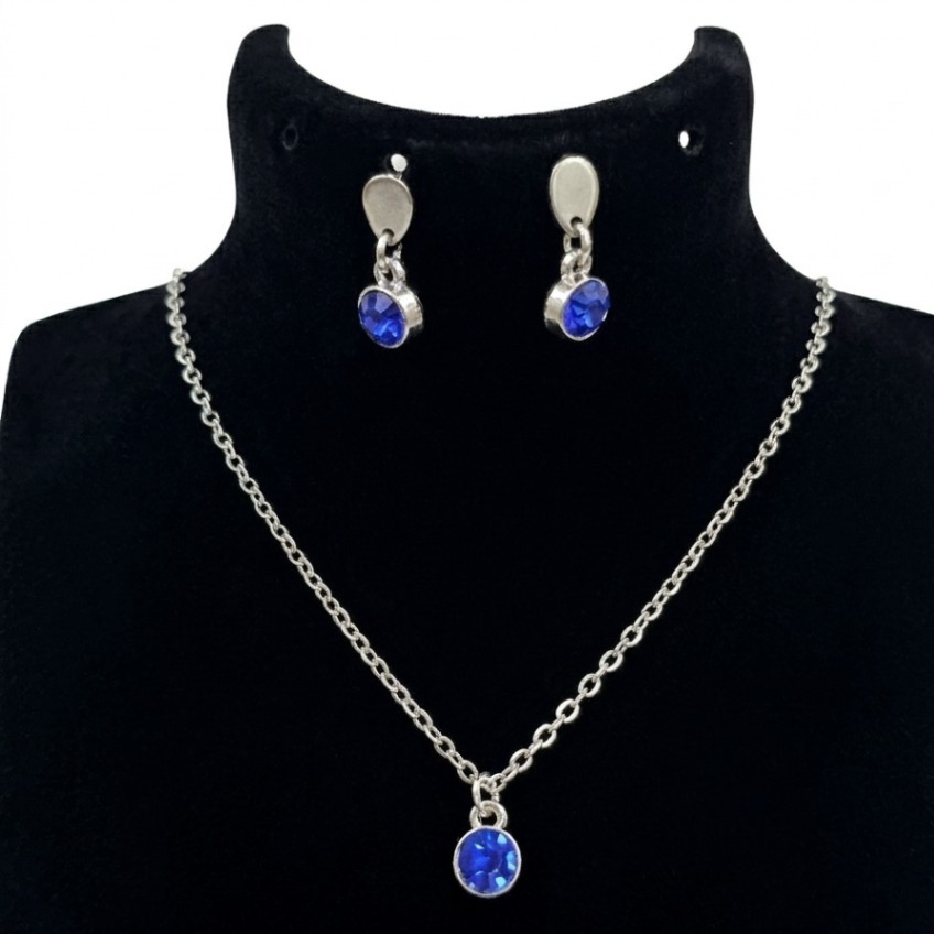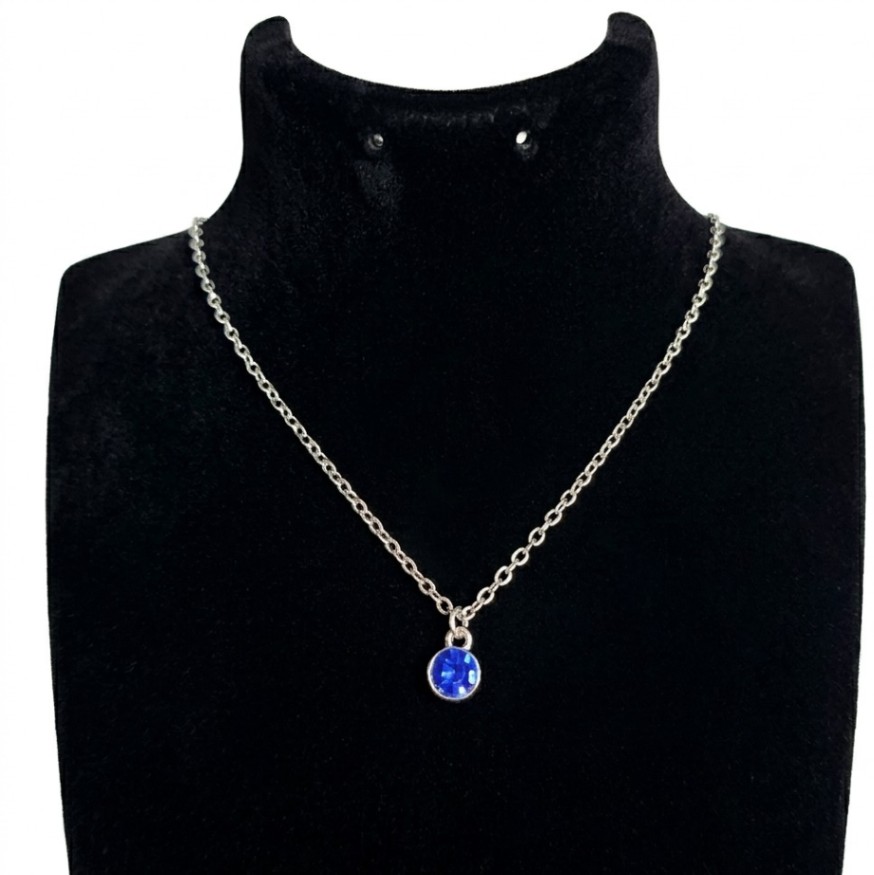 This necklace is designed for a refined and timeless look. It features a brilliant, faceted deep blue crystal charm that captures the light, suspended on a polished silver-tone chain.