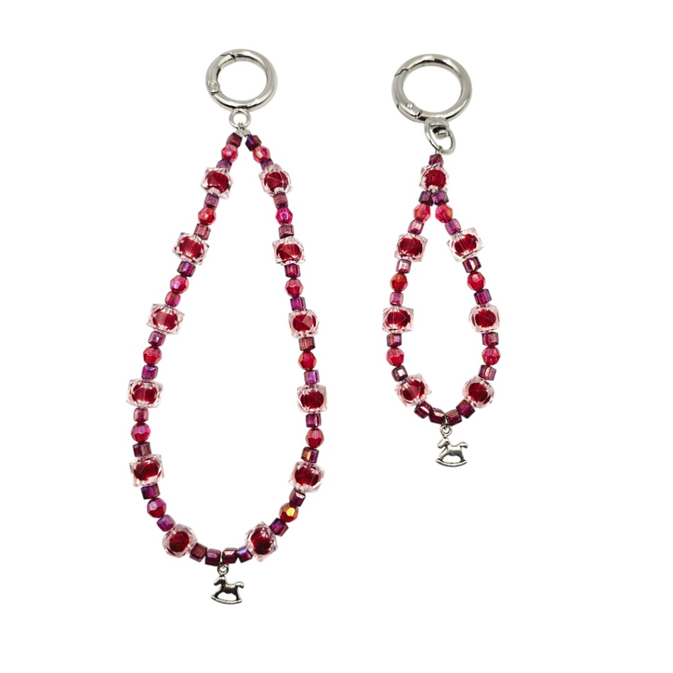 The Scarlet Gallop Set is a coordinated duo featuring a beaded phone strap and matching keychain, perfect for those who love deep, rich tones and whimsical details.
