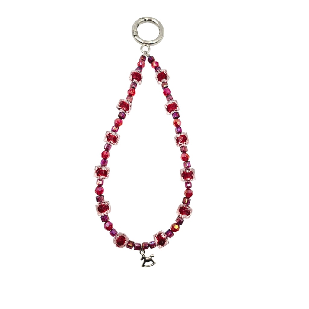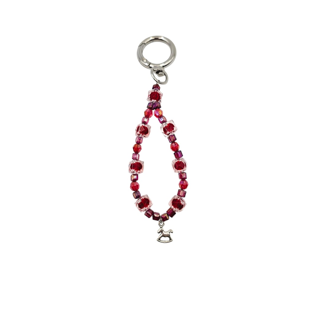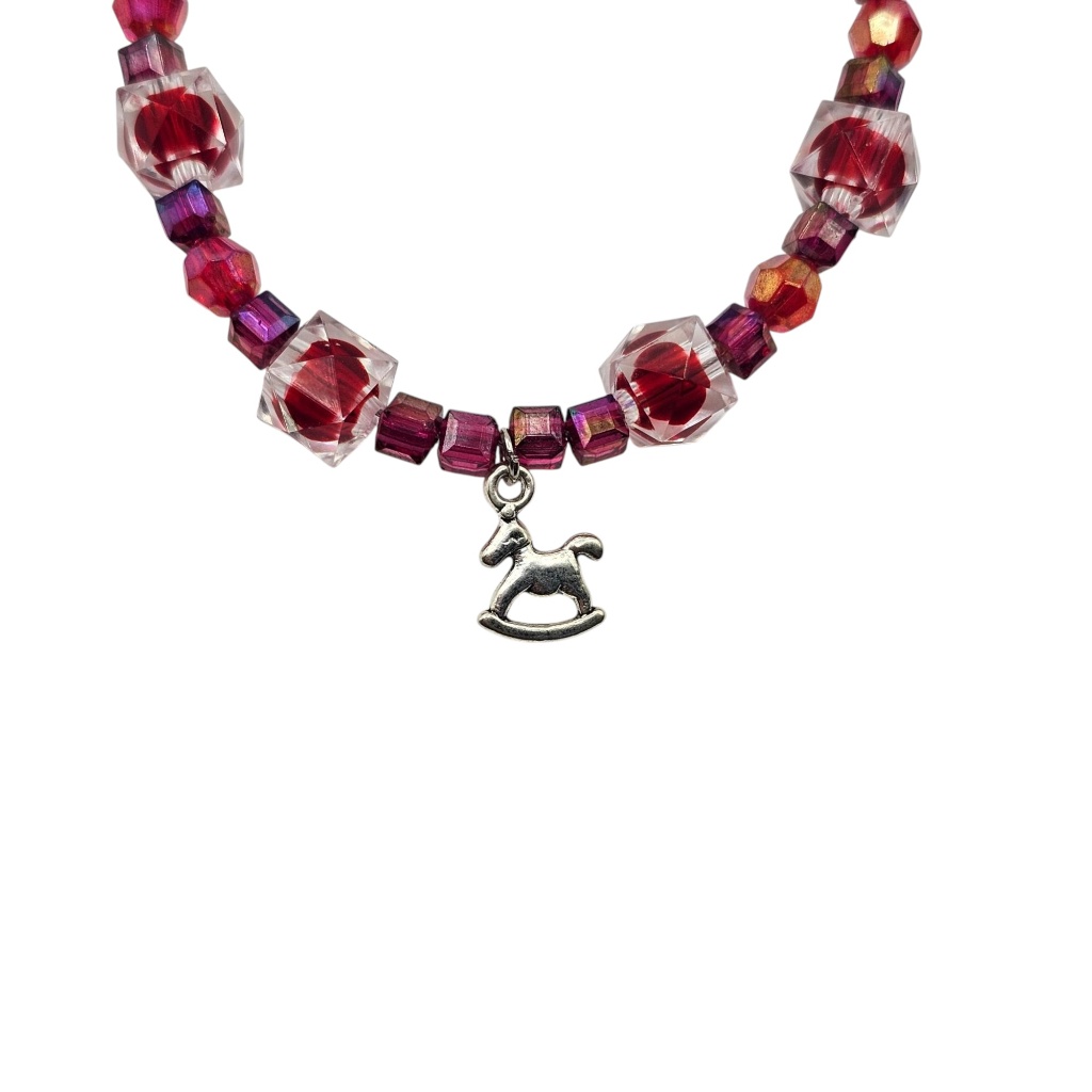 This set is crafted using a mix of ruby-red faceted beads and larger, light-catching cubic crystals that create a striking geometric sparkle. The silver-tone rocking horse charms add a nostalgic and playful touch, making this set a unique standout piece for your collection.