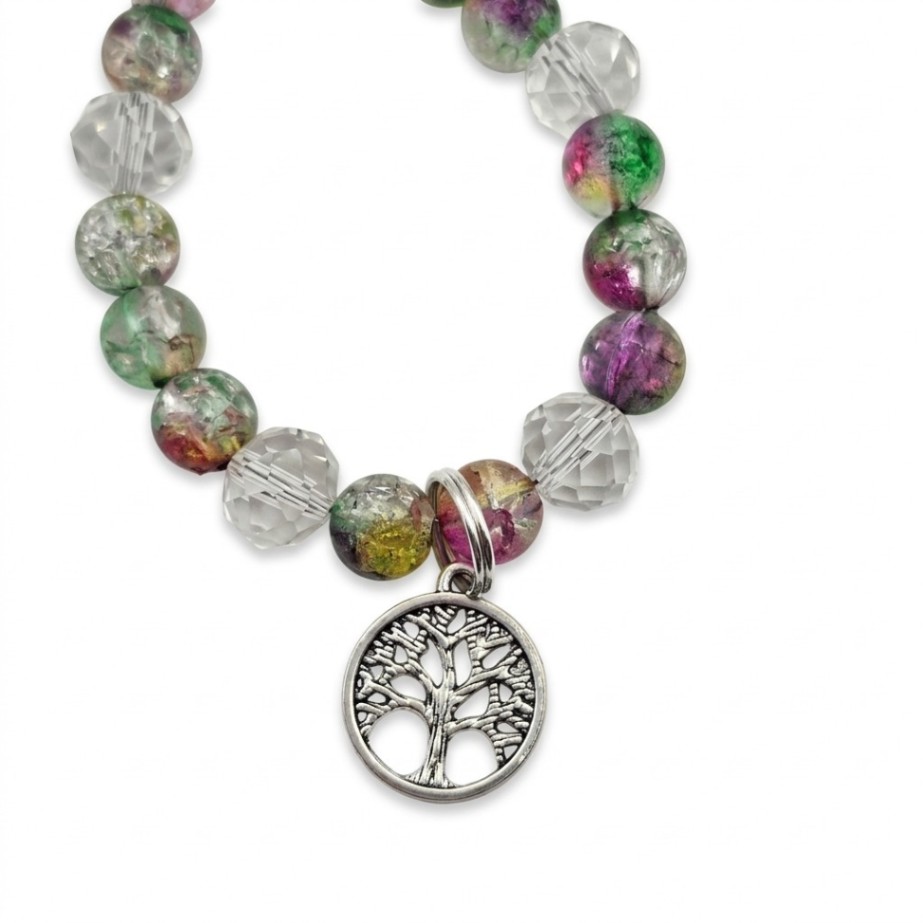 Embrace the symbol of growth and strength with this elegant beaded keychain. It features a finely detailed Tree of Life pendant in a polished silver finish, surrounded by a sequence of crackle-effect beads in vibrant forest green, deep pink, and mossy tones.